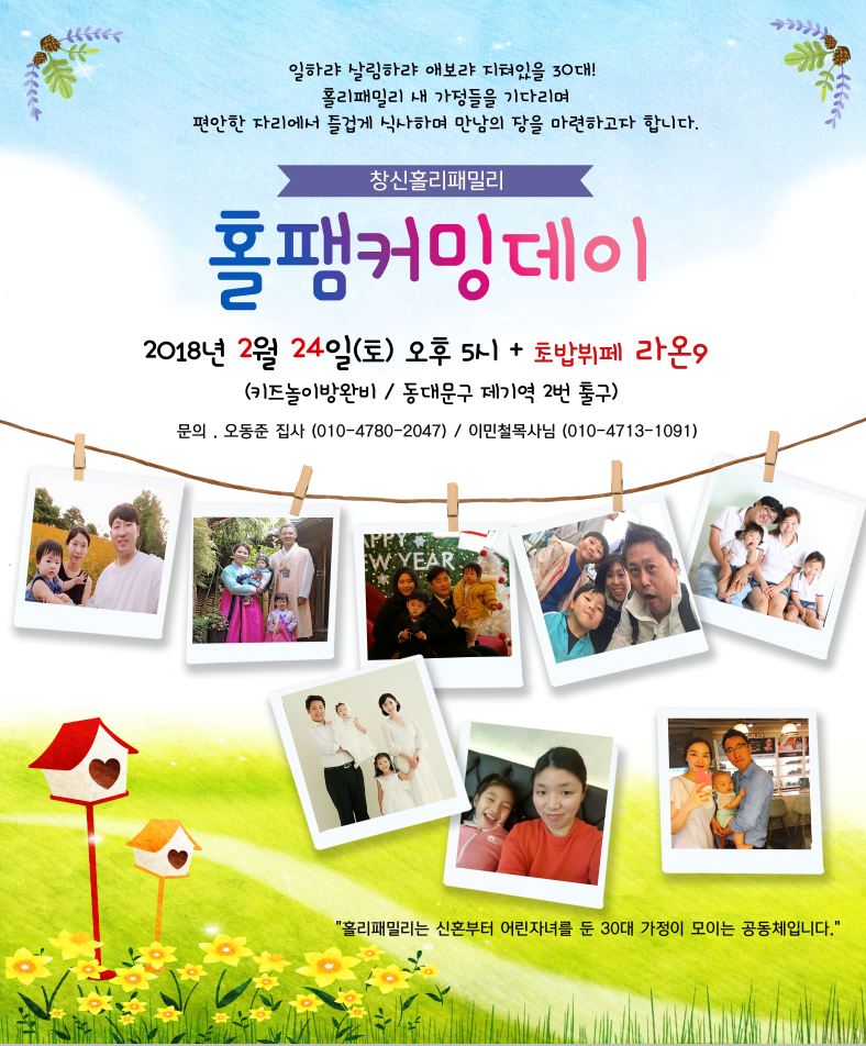 신혼가정과 미취학자녀를 둔 가정을 대상으로 하는 홀리패밀리 커밍데이가 24일(토) 오후 5시, 라온9 (제기동역 2번출구)에서 있습니다.