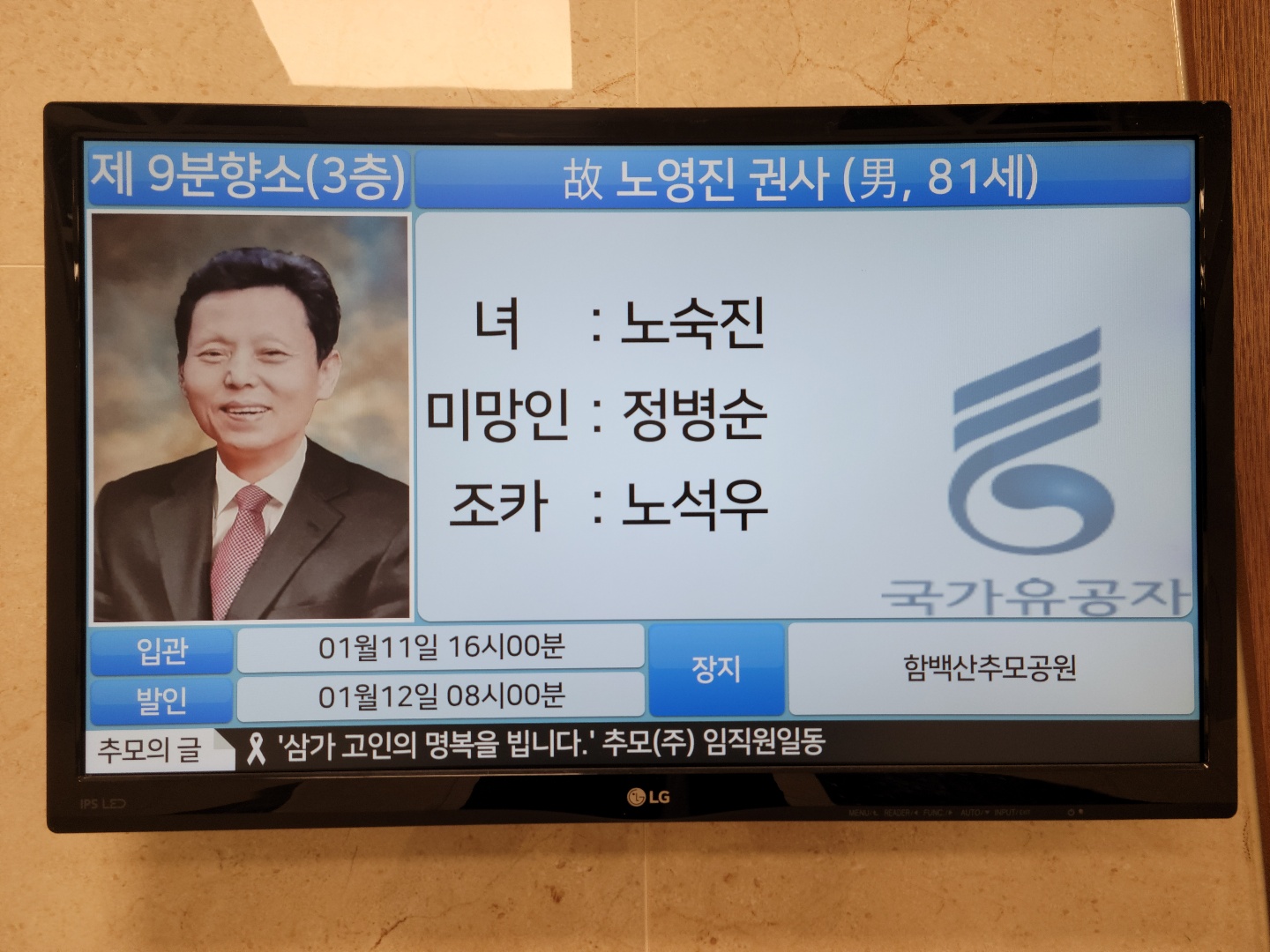 위로드립니다. 소망 18구역 고 노영진 명예권사님께서 10일(월) 오전 하나님의 부르심을 받으셨습니다.